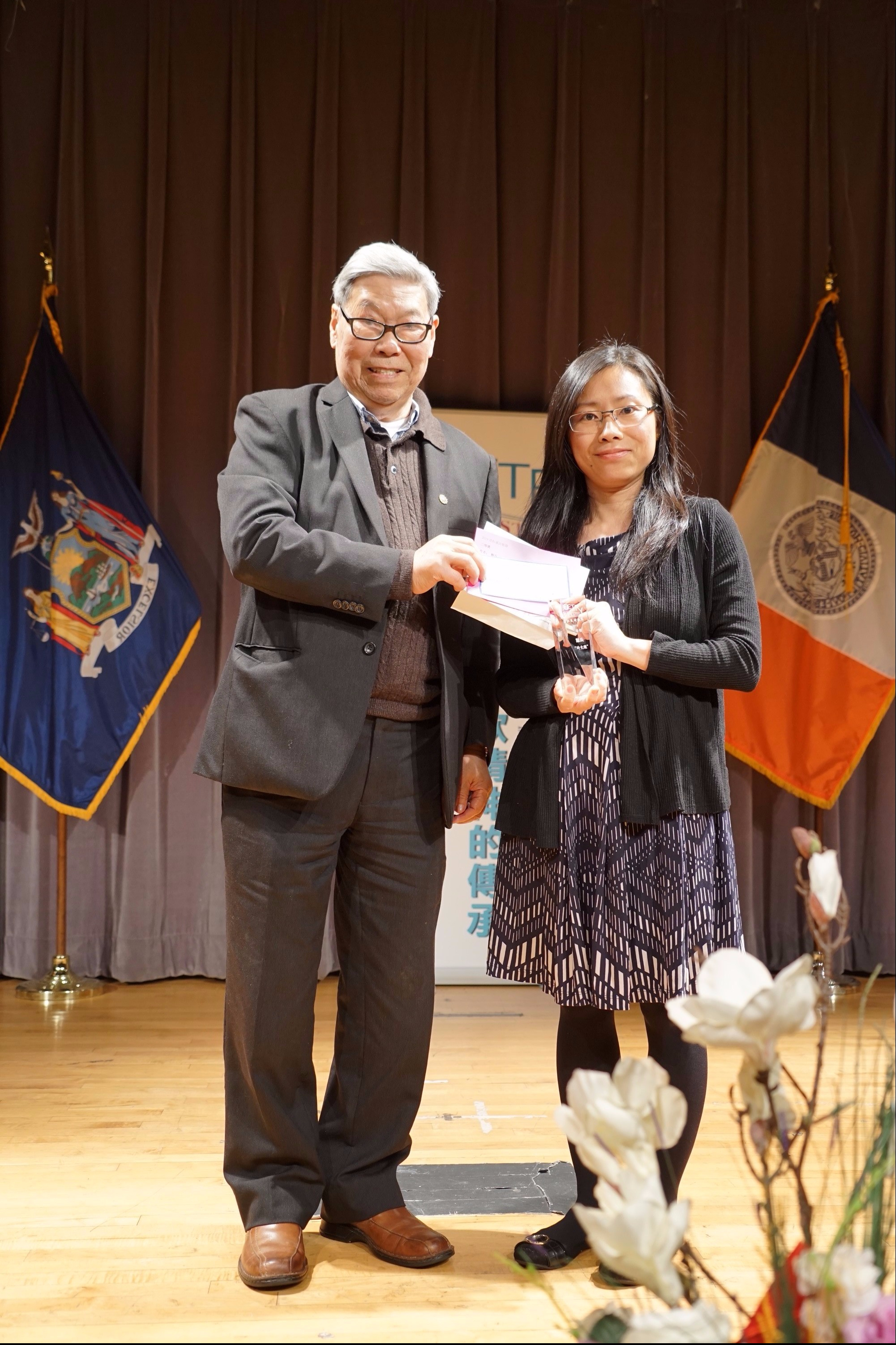 美女诗人甘草(右),代获奖者离兵领奖