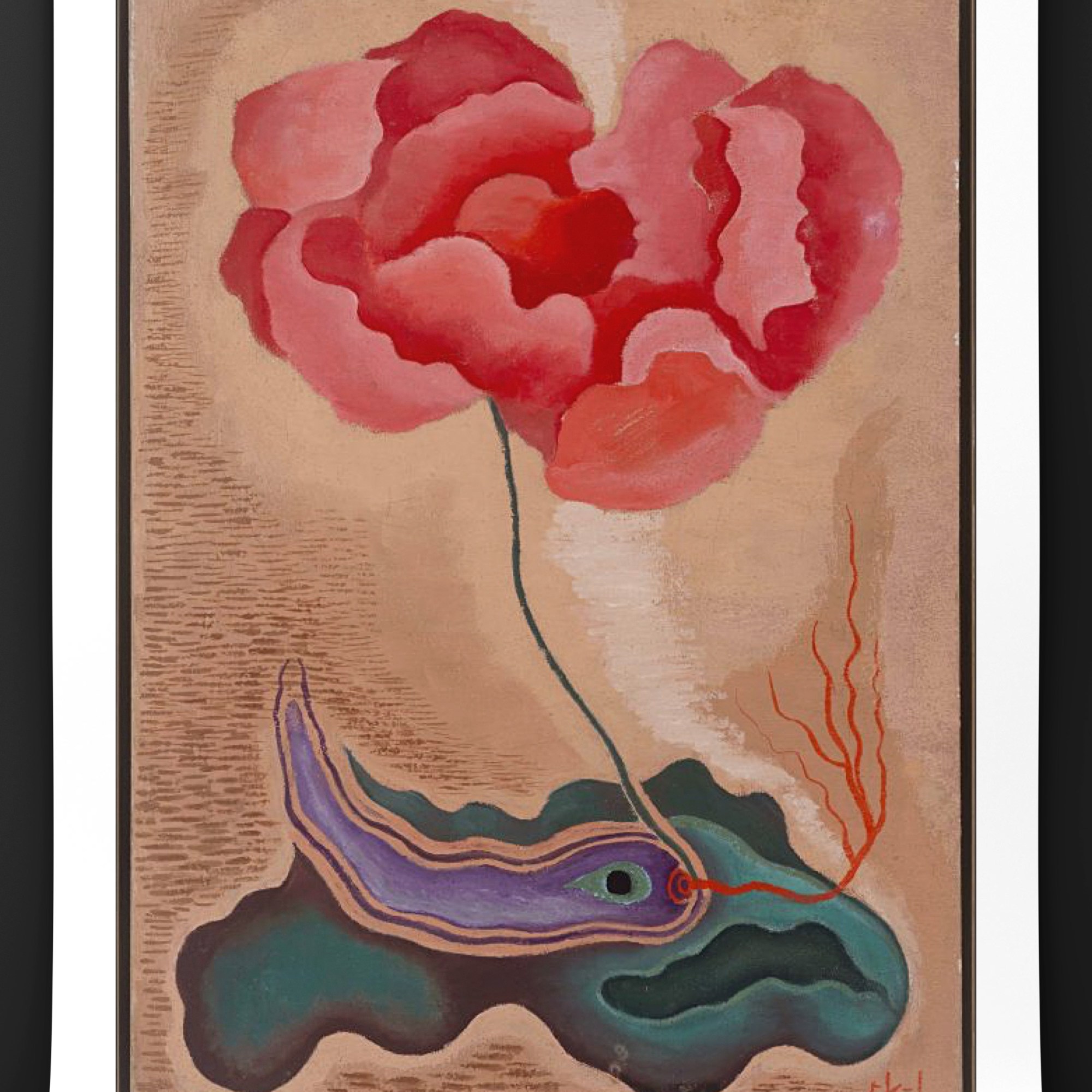 Throughout the 1930s, Kernn-Larsen’s style moved from a more decorative style to surrealism. She regularly attended exhibitions as one of the only female surreal artists, including the London International Surrealist Exhibition in 1936. In 1937, Kernn-Larsen moved back to Paris and met Peggy Guggenheim, who opened a solo exhibition for her the following year in London. She remained in London throughout the war years with her husband, Jewish art dealer Isak Grünberg. At that time she departed from surrealism, focusing on a more real approach to her paintings during the war.