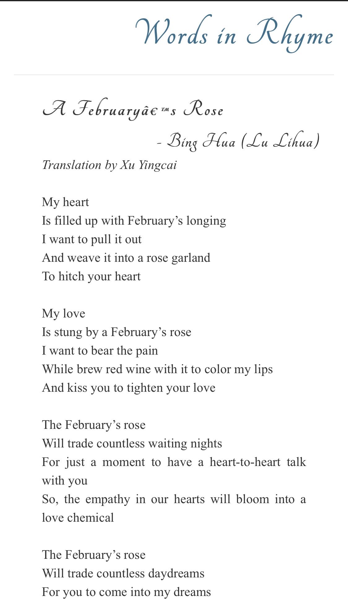* 詩人冰花的英語詩集February’s Rose已由Finishing Line Press出版,如欲收藏此本作品,請留言或與原作者冰花聯繫。或點擊網上售書鏈接購買🔗https://www.finishinglinepress.com/product/februarys-rose-by-bing-hua-translator-yingcai-xu/
