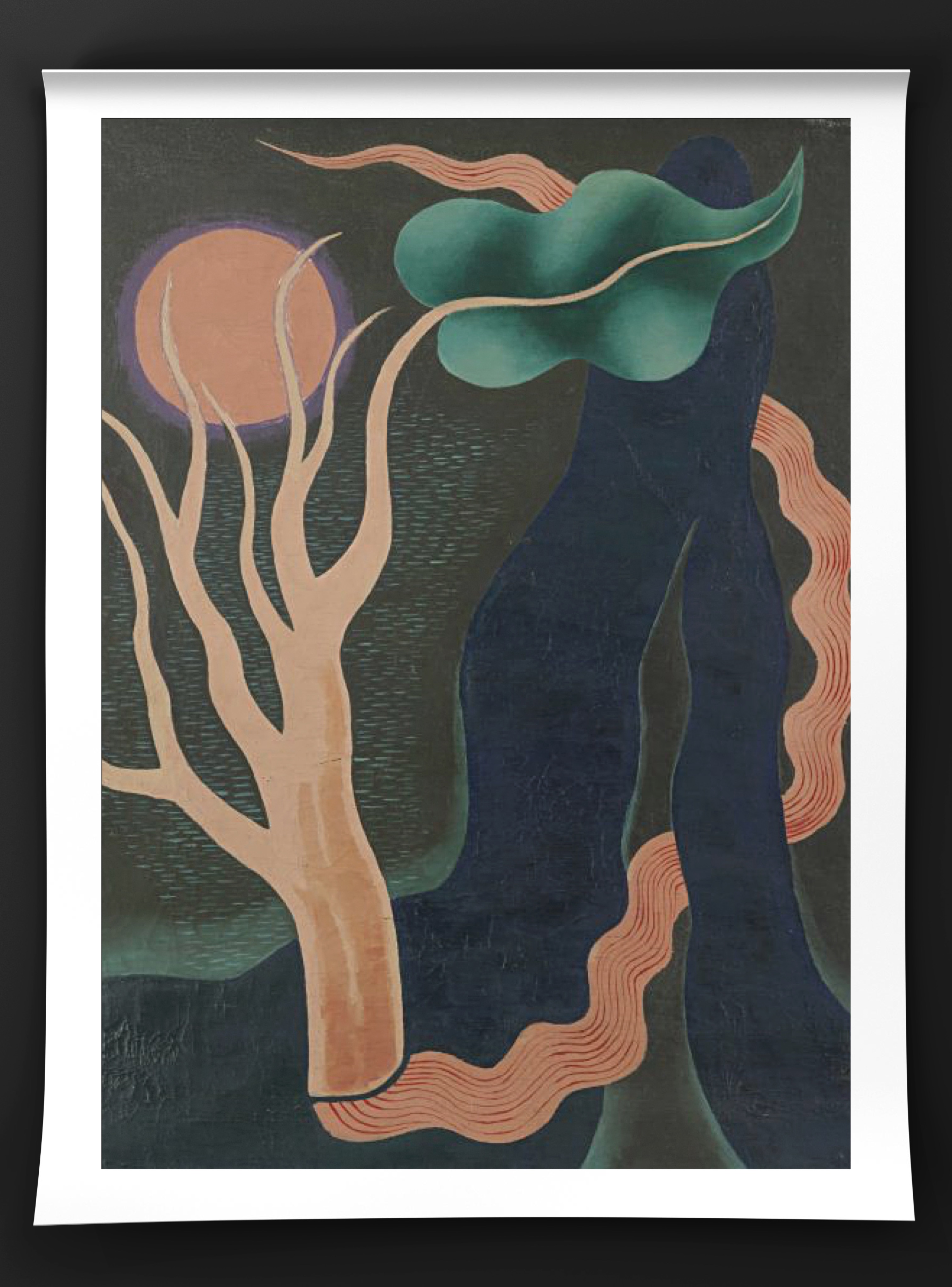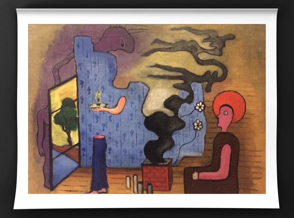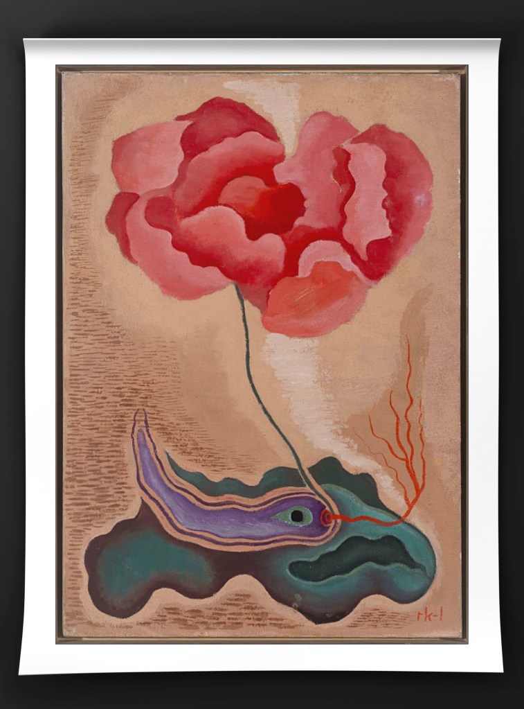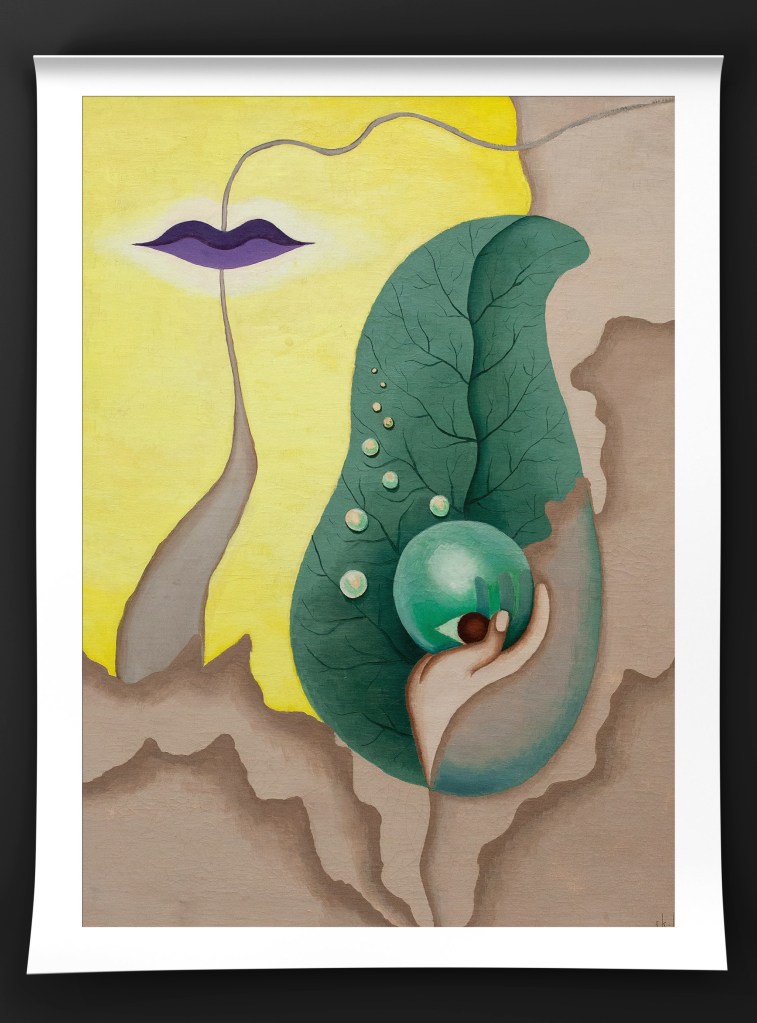 Throughout the 1930s, Kernn-Larsen’s style moved from a more decorative style to surrealism. She regularly attended exhibitions as one of the only female surreal artists, including the London International Surrealist Exhibition in 1936. In 1937, Kernn-Larsen moved back to Paris and met Peggy Guggenheim, who opened a solo exhibition for her the following year in London. She remained in London throughout the war years with her husband, Jewish art dealer Isak Grünberg. At that time she departed from surrealism, focusing on a more real approach to her paintings during the war.