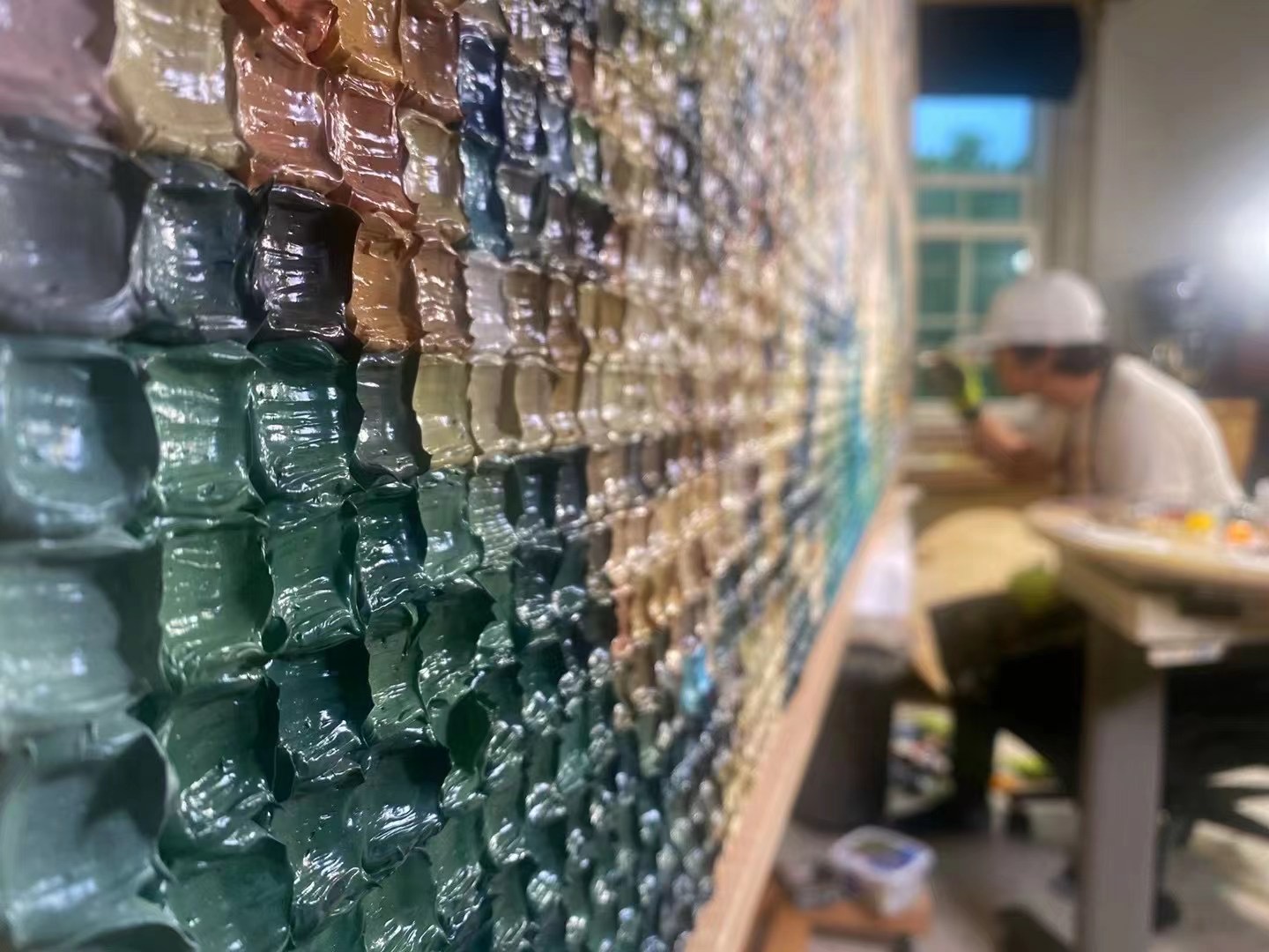 現在,石村的石村塊油畫以極簡的方式,將心裡的東西講得一清二楚,每一塊精心調和出來的油彩畫出來的形像也如同波普藝術的簡單符號,非常討喜地佔據著畫布的正中,讓人一瞬間忘記了藝術,忘記了油畫的本質,而以為在觀看一個漂亮的裝幀,一堆晶瑩剔透的彩色糖塊。最初,石村將他的石村塊油畫稱之為禪宗馬賽克,作為一種與眾不同的繪畫方式,石村塊油畫運用油畫最基本的功力,每一筆都進行油彩的混合調色,然後一筆一格地進行繪畫,整個過程無法像一般油畫那樣任意揮灑,而是需要長時間地靜坐,宛如禪宗的冥想打坐一樣需要內心的定力。馬賽克是一種表現手法,而禪宗則是內在思想。禪宗表達的是一種意境與境界,而馬賽克繪畫的創作過程本身就已經傳述著禪宗般的想法和意境。