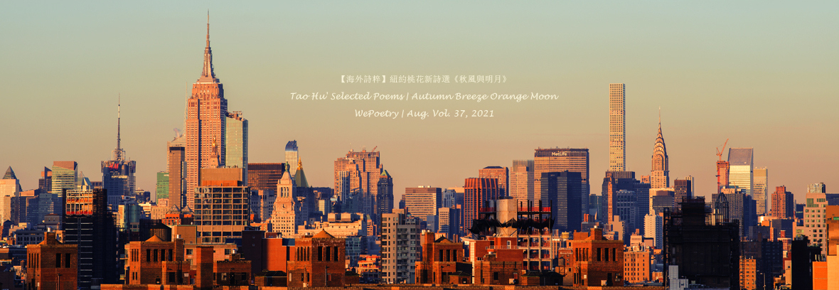 *【海外詩粹】紐約桃花新詩精選《秋風與明月》中的全部詩文及其刊內圖片已由詩人紐約桃花授權,版權歸原作者紐約桃花所有。刊首圖片《黃昏中的曼哈頓》已由作者寒山老藤授權,版權歸寒山老藤所有。任何個人或網絡平台如欲用稿,請與原作者聯繫。